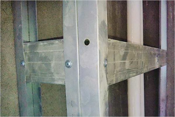 Перемычки нарезаются по размеру (ножницами по металлу) крепятся саморезами. При небольшом расстоянии — до 50 см — достаточно один с каждого конца, при большем луче поставить два. Шаг установки стоек около 60 см, перемычек — примерно с таким же шагом. В месте крепления дверки (если такая предусмотрена) ставят усиленный — двойной профиль.