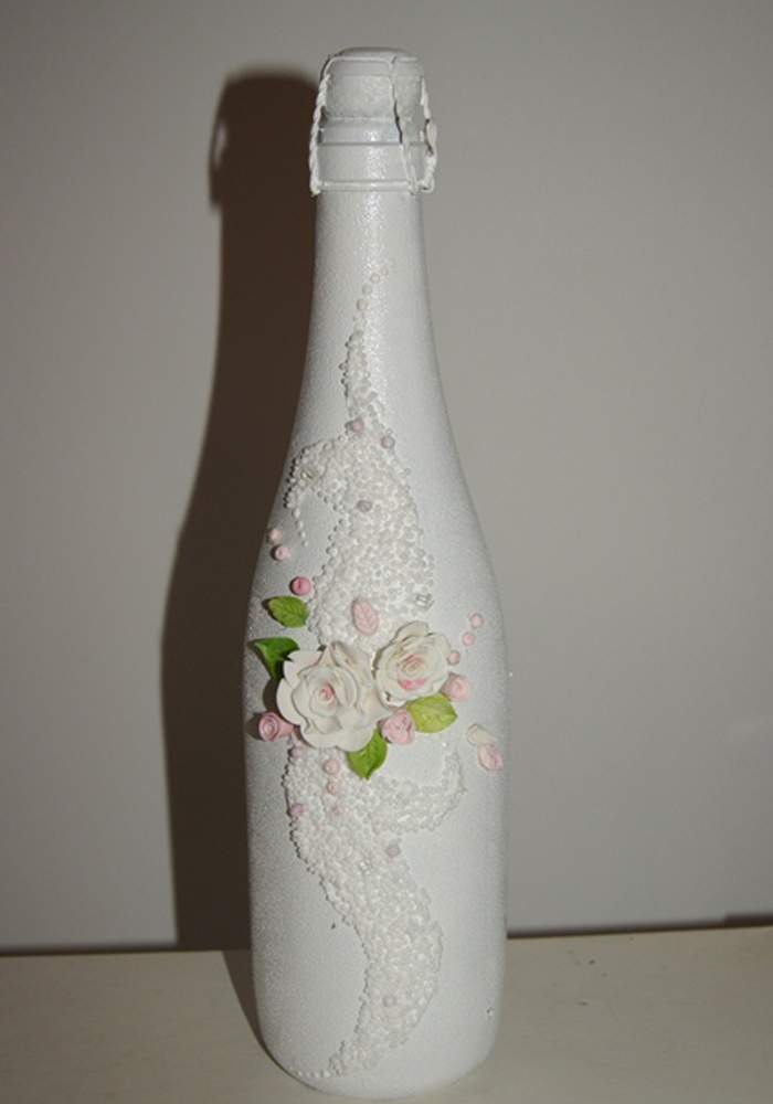 Сначала нужно подготовить бутылку, сняв с нее бумажную наклейку и покрыв сверху слоем краски из аэрозоля. После того, как она высохнет, следует карандашом нанести рисунок, по которому будут располагаться цветы, и приклеить их на бутылку. Теперь осталось лишь украсить оставшееся пространство контуром, бусинами, стразами и полубусинами. Украшение бутылки на свадьбу готово!