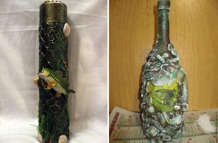 Декор бутылки для мужчины по случаю 23 февраля или любого другого праздника зависит от того, какой символизм вы хотите придать подарку и какие увлечения есть у будущего обладателя. Так, если мужчина без ума от рыбалки, логично будет использовать эту тему, например, декупаж или украшения в виде рыбок, ракушек, якорей, монет или других элементов, выполненных из соленого теста либо полимерной глины.