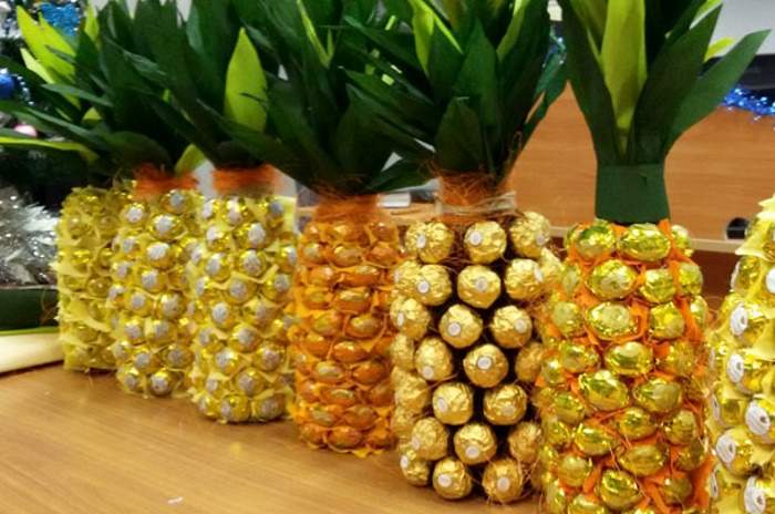 Очень красивым и одновременно вкусным вариантом является украшение бутылки шампанского конфетами. С их помощью и применением других подручных средств вы можете превратить бутылку в своеобразный «ананас». Для этого вам понадобится: