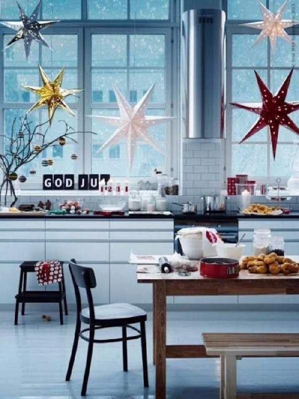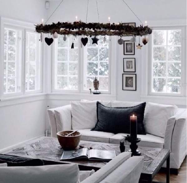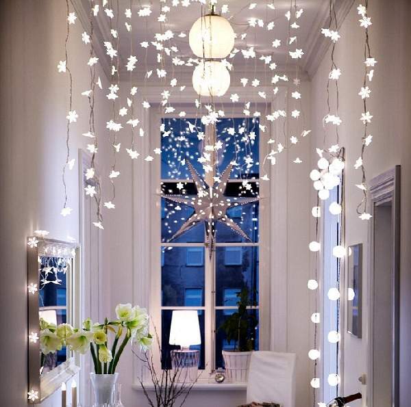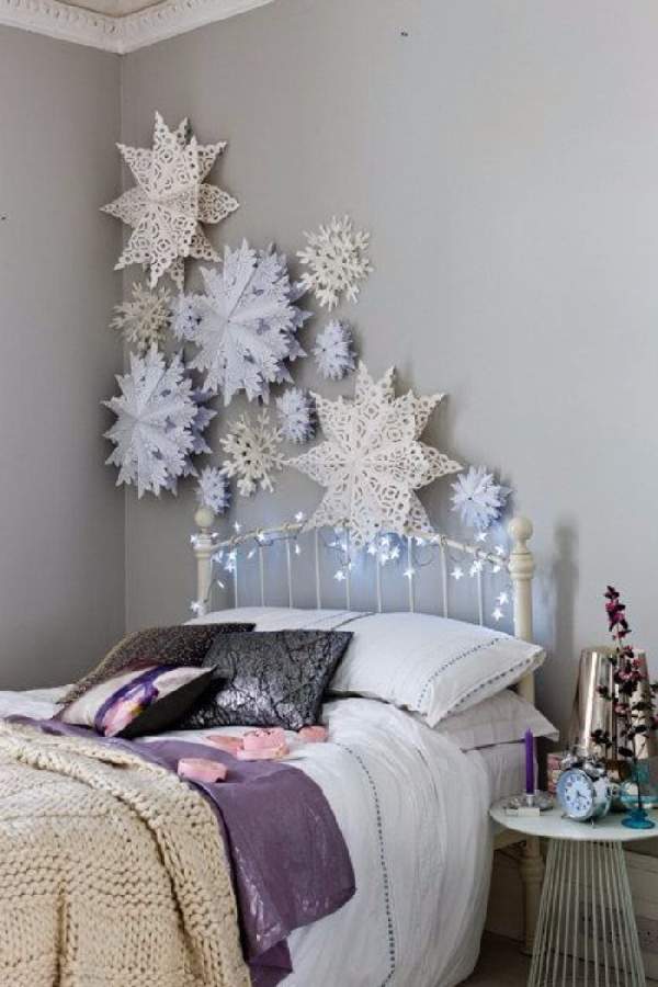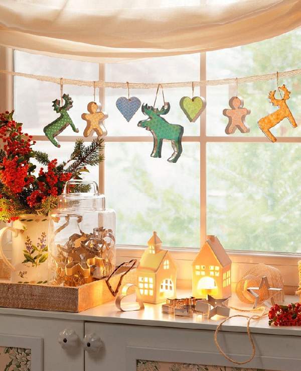 Горки из свечек на подоконнике, подвешенные на нити снежинки, звездочки, полумесяцы и другие фигурки внесут атмосферу новогоднего уюта в интерьер комнаты.