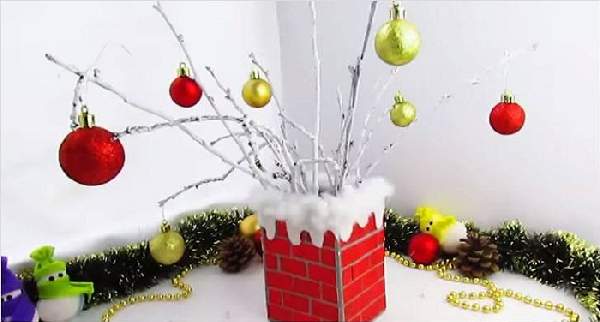 Украсить комнату к Новому году своими руками можно, смастерив симпатичный маленький дымоход. Для этого необходимо из листа картона прямоугольной формы сделать коробку, оклеить ее белой бумагой, а потом покрасить в серый цвет (его можно получить, смешав белую и черную краски). Из листа красного картона вырезаем небольшие прямоугольники и оклеиваем ими коробку в виде кирпичной кладки. Из ваты или синтепона можно оформить имитацию снега на краях дымохода, а вовнутрь поставить веточку ели, украшенную игрушками.
