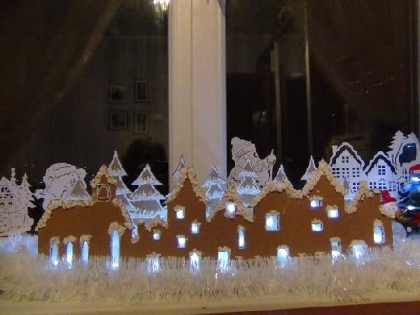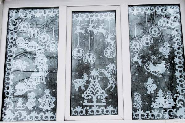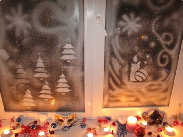 Окно в комнате может послужить мини-сценой для создания настоящего сказочного новогоднего ансамбля. На фото в статье Вы можете увидеть примеры того, как украсить сказочно комнату на Новый год, декорируя окно, с использованием самых простых материалов: бумаги, зубной пасты, мишуры, свеч и пр. Из белого картона можно вырезать и склеить зимний лес или городок с небольшими домами, а вовнутрь заложить светодиодную гирлянду. Всю композицию красиво дополнит белая мишура, создавая эффект заснеженности. На примерах также видно, как оригинально украсить комнату на Новый год с помощью разных техник нанесения рисунка на стекла окон, на стеклянные двери и зеркала. Для этого используют зубную пасту, хотя лучше приобрести зубной порошок, который можно растворить в воде до нужной консистенции и развести с обычными красками для рисования. Трафареты рисунков приобретают или заготавливают из картона самостоятельно.