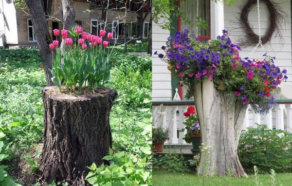 Часто на участке остаются пни. Выкорчевывать их долго, в процессе потопчут все вокруг… Торчат, пока не станут трухлявыми и не рассыпятся сами. А из пеньков можно сделать очень интересные вещи. Например — использовать как клумбу.