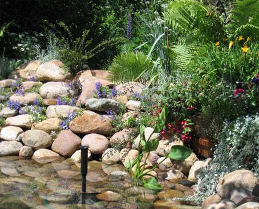 По той же технологии можно края выложить валунами, собранными на берегу реки (или купленными в садовом центре).