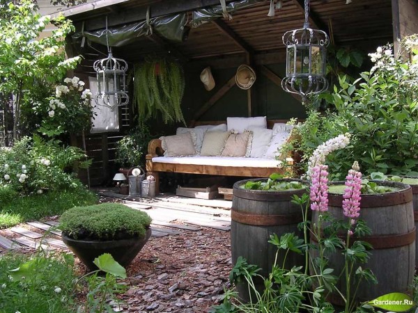 Деревенский стиль легко узнаваем по характерным «хозяйственным» элементам декора. Внутренние ограды — плетень или штакетник, цветы — в кадках, бидонах, телегах. Скамейки и садовая мебель нарочито грубые, если и покрашенные, то темным тонирующим составом, а не укрывными красками.