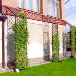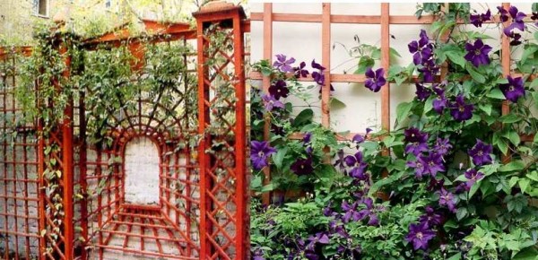 Если вам «повезло» и в ваш сад выходит глухая стена, ее тоже можно задекорировать своего рода заборчиком, по которому пустить вьющиеся растения. Интересный вариант представлен ниже. Когда плющ чуть разрастется будет очень красиво. Вместо плюща можно посадить клематис. Зимой, вид, кончено, хуже, зато летом…