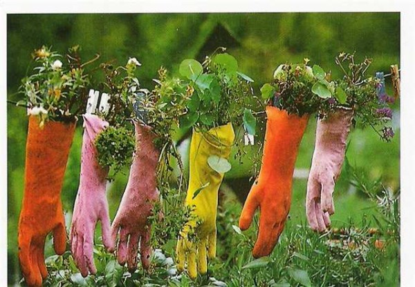 Даже прохудившиеся резиновые перчатки идут в дело. Хорошо, что цвета яркие, а основа плотная. Насыпают грунт, высаживают однолетники, привязывают на деревья или веревки, прибивают на заборы. Весело и ярко.