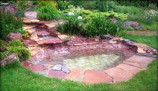 Красивый красный гранит, да еще и ручей. Это украшение сада потребовало терпения при устройстве и обошлось в приличную сумму