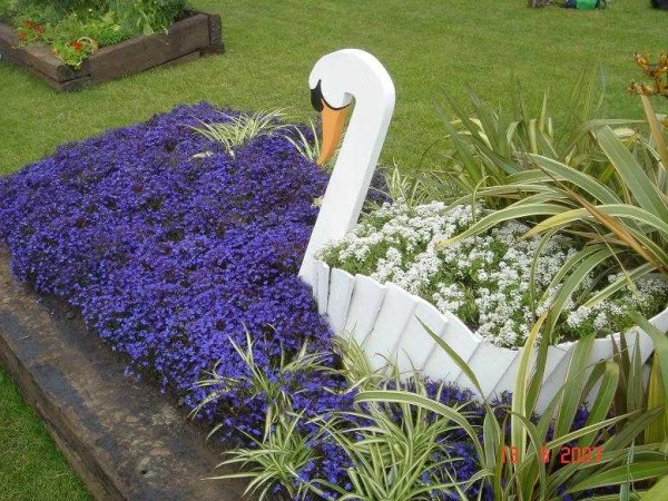 О том, что из автомобильных покрышек делают клумбы и вазоны знают все, но вот о том, что из дощечек можно сделать замечательную клумбу в форме лебедя, знают, наверное, немногие. Такой замечательный лебедь получился: вырезали «перья», скрепили проволокой, проклеили, голова и шея выпилена из доски.