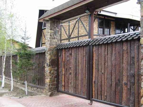 Можно сделать самобытный забор из горбыля. Повозится придется — и обработать хорошо от паразитов, и подобрать доски одну к другой так, чтобы щелей было как можно меньше. Возможно, придется подрабатывать их топором или рубанком. Но горбыль — почти бросовый материал, цены на него низкие, так что есть шанс получить дизайнерскую ограду за малые деньги.
