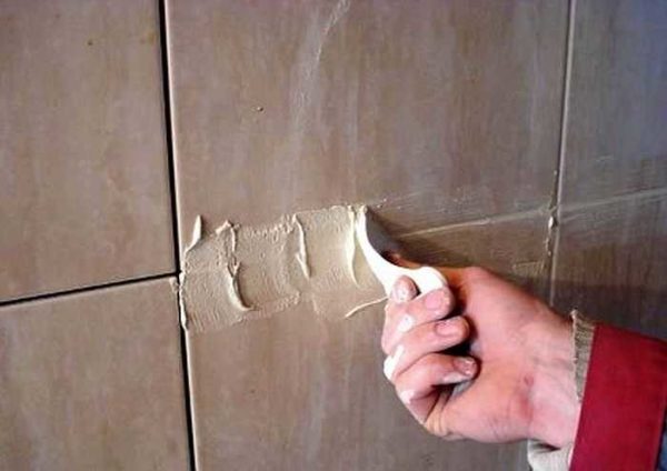 Выбранную пасту разводят по инструкции, которая есть на упаковке. Должна получиться консистенция, близкая к сметане, может, чуть гуще. Берут резиновый шпатель, зачерпывают небольшое количество затирки. Движениями наискосок по отношению к шву, наносят пасту, затем подбирают излишки, проведя шпателем вдоль шва.