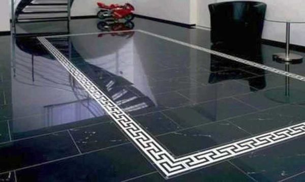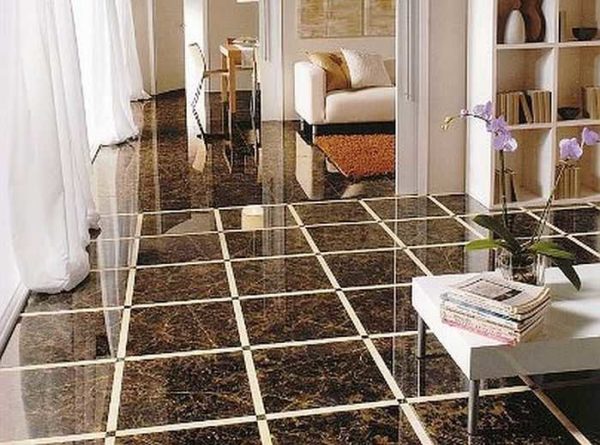 - Полированный и полуполированный (отличается степенью полировки и блеска). Этот вид имеет наиболее эффектный вид. И, хотя стоит дороже остальных видов, используется достаточно часто. Но стоит иметь в виду, что в процессе эксплуатации полировка становится тусклее и со временем поверхность становится матовой. Есть полированного керамогранита еще один недостаток — полировка открывает закрытые ранее поры. В результате пролитая жидкость впитывается, остаются следы. Потому многие производители покрывают плитки керамогранита лаком. Если такого покрытия нет, его надо нанести после укладки. Еще один неприятный момент: если на такую поверхность попадает жидкость, пол становится очень скользким.