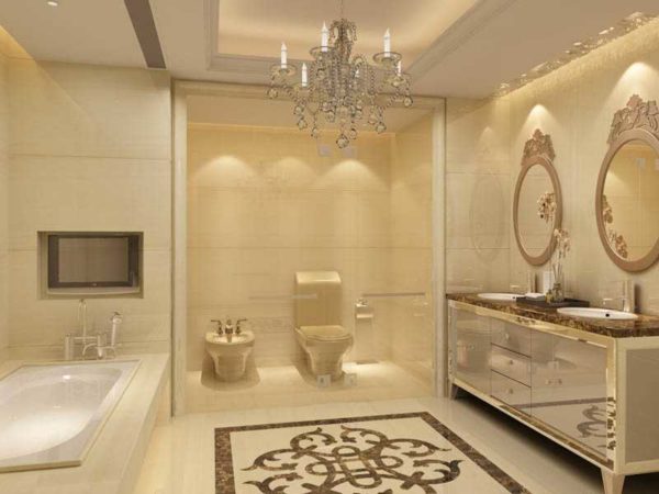 Шикарный интерьер ванной с использованием полированного керамогранита