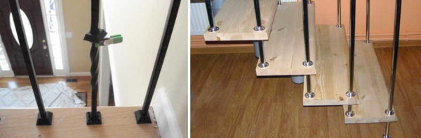 Еще вариант установки балясин из прутка: приварить к нижней части шпильку, вкрутить в ступеньку. При желании в отверстие в ступеньке можно вклеить гайку.