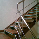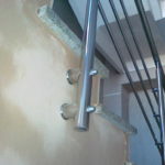 В установленные подпятники вставляются металлические балясины/стойки, выставляются строго вертикально, привариваются. «Прихватывать» лучше с четырех сторон — чтобы исключить возможность отклонения в любую сторону. На этом установка балясин из металла (нержавеющей, никелированной, хромированной стали) закончена. Дальше только надо установить поручень, что тоже не особо сложно.