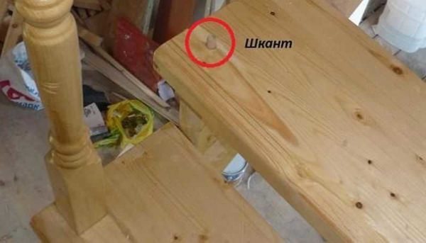 В оба отверстия наливается эпоксидный клей, шкант вставляется в отверстие в ступени до упора, затем, на него надевается балясина. Для большей надежности такого крепления клеем можно промазать всю нижнюю часть балясины.