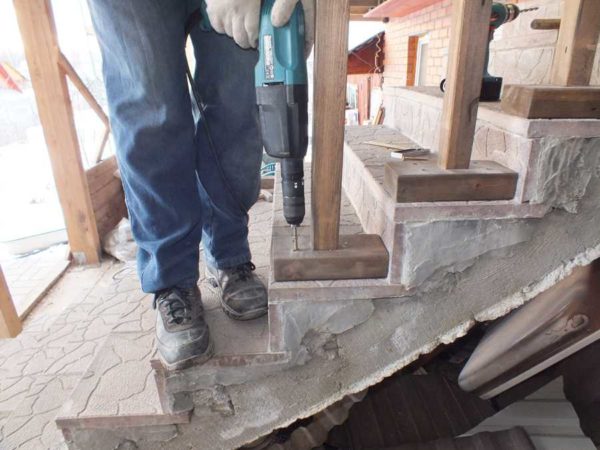 Не самая элегантная установка балясин из дерева на каменные или бетонные ступени , но надежная