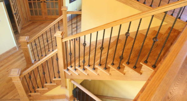 Основная задача этого этапа — как можно точнее перенести прямую на ступени. Вторая — выбрать такое расстояние между столбами и балясинами, чтобы не было заметных глазу отличий. Если не получается сделать все одинаково, можно делать симметрично — большие или меньшие оставить расстояния по краям или чередовать их через один или два. Универсальных решений нет, так как каждая лестница уникальна, со своими параметрами и особенностями.