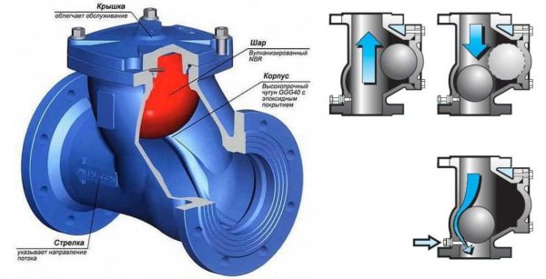 Еще один вариант запирающего устройства в обратном клапане — шарик. В этих устройствах большую роль играет внутреннее строение корпуса. Верхняя его часть разработана так, что при прохождении стоков шарик закатывается в специальное углубление в корпусе, открывая проход.