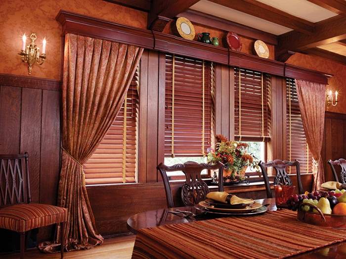Такие конструкции хороши для любых помещений, будь то гостиная, спальня и др. Деревянные карнизы для штор изготавливаются из натурального материала. Использование на них разнообразных покрытий с помощью нанесения лака, краски или тона, создает вид той или иной древесины: красное дерево, махагон, орех, сосна, бук, дуб.