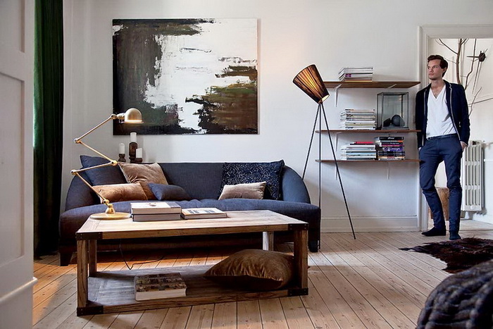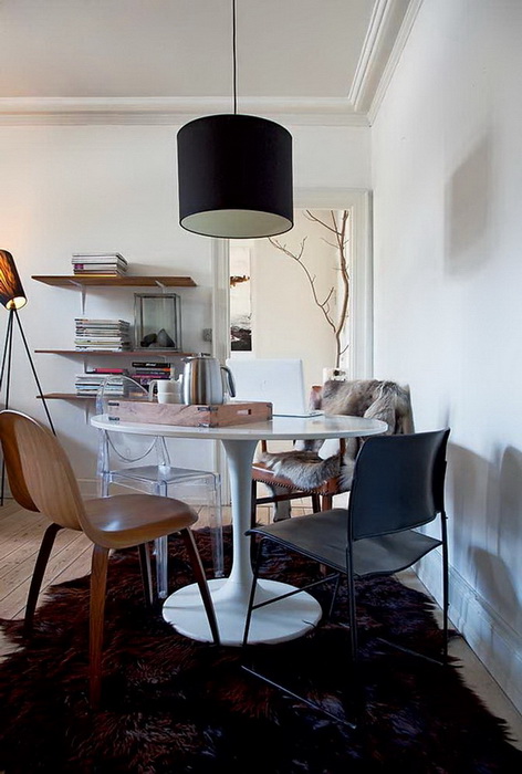 Дощатые полы (причём настоящие, не ламинат) сразу создают уютную обстановку, ни холодные белые стены, ни окна без штор уже ничто не испортит впечатление от тёплого натурального дерева. Этот простой деревянный пол создал весь интерьер, именно, пол служит фоном всем интересным деталям этой квартиры.