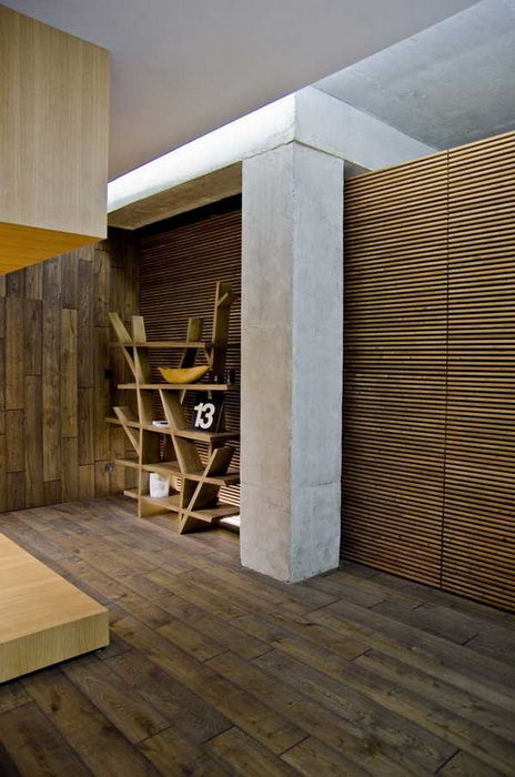 Если заглянуть внутрь квартиры-лофта через огромное окно, то можно увидеть одну из самых интересных деталей апартаментов — стену с текстурой в виде лучей, в центр которой встроен экран TV внушительных размеров, а в нижнюю часть — акустическая система и книжные полки.