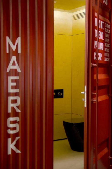 В красном контейнере расположена ванная комната, оформленная в желтом и черном цветах.