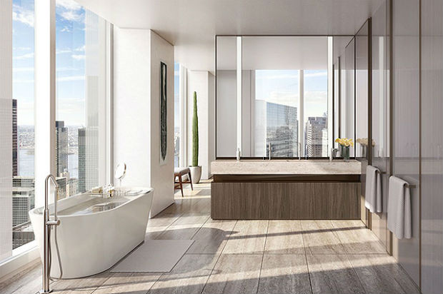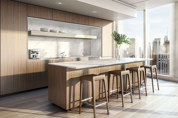 Квартира оформлена в светлых тонах, и в ее декоре использовано натуральное дерево. Кухонная зона смотрится очень лаконично и даже просто. Разве что дизайнерские барные стулья привносят долю изыска. Здесь же на кухне находится гостиная, и таких гостиных в квартире несколько. Ванна расположена прямо у панорамного окна, вот такая романтика – принимать ванную и любоваться ночным Нью-Йорком. Но при желании окна закрываются жалюзи.