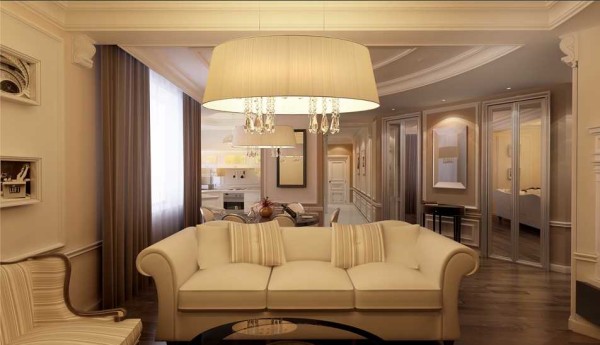 Разрабатывая дизайн квартиры в классическом стиле, не забывайте об освещении. В центре помещения устанавливают массивную люстру с большим количеством подвесок. Чаще всего они сделаны из хрусталя. Остальное освещение может быть периферийным потолочным (встроенные светильники), сделано при помощи бра и других настенных светильников.