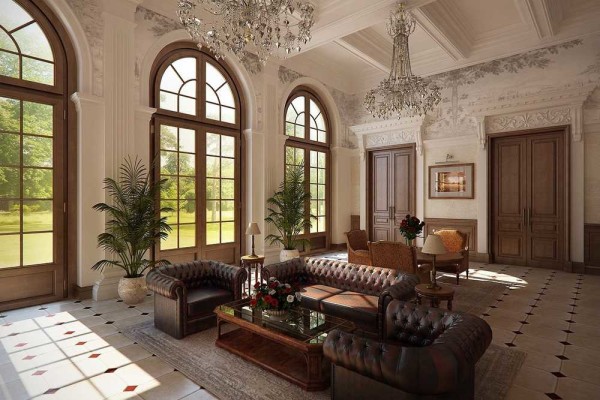 Оформление окон традиционное для этого стиля: тяжелые портьеры с ламбрекенами и драпировками. Зачастую их подвязывают, создавая еще более пышное оформление. Не менее традиционное и освещение — люстра по центру потолка и боковые встроенные или настенные светильники.