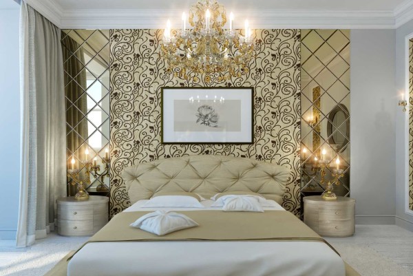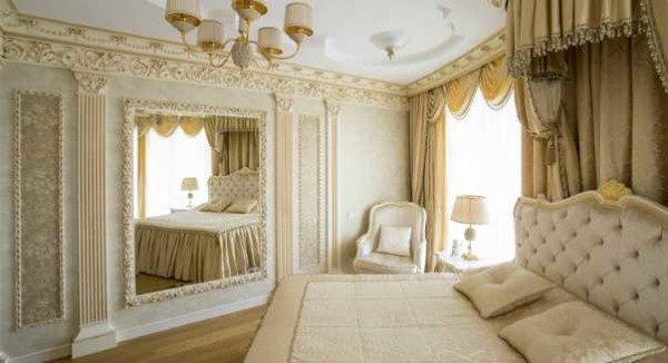 Чтобы разнообразить декор стен часто делают полуколонны, а зеркала — непременный атрибут таких помещений. Шкафы при этом ставят редко, стараются сделать гардеробную, чтобы не нагружать громоздкой мебелью пространство и не нарушать гармонию. Что еще из мебели может присутствовать? Туалетный столик с банкеткой, прикроватные тумбочки, небольшое кресло или софа. Но при этом свободного пространства должно быть много. Если спальня не отличается объемами, оставляйте минимум — кровать, туалетный столик, прикроватные тумбочки.