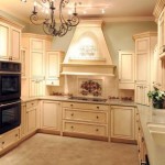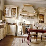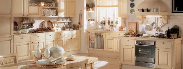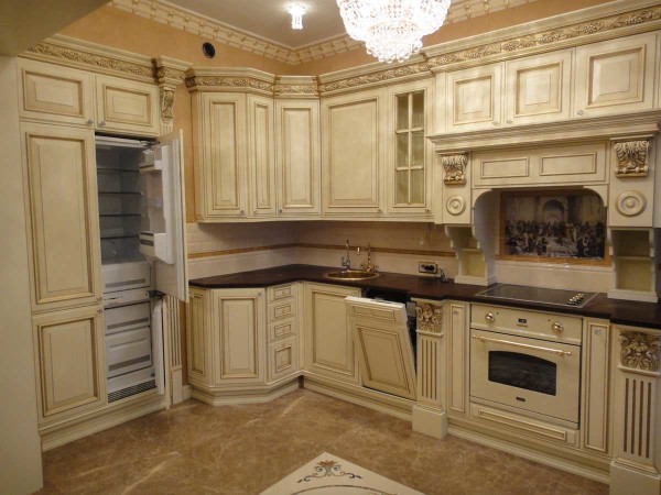 Кухонный гарнитур выполнен из древесины, может быть окрашен в белый, сливочный или светло-бежевый цвет. В таком варианте может быть позолота или небольшие элементы дополнительного цвета, используемые в остальном оформлении.