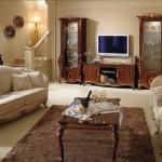 В гостиной обычно присутствует телевизор. Чаще всего он находится напротив дивана. Его размещают на тумбе характерного дизайна, по бокам могут быть шкафы с парадной посудой или другими предметами, возможно — коллекциями хозяев.