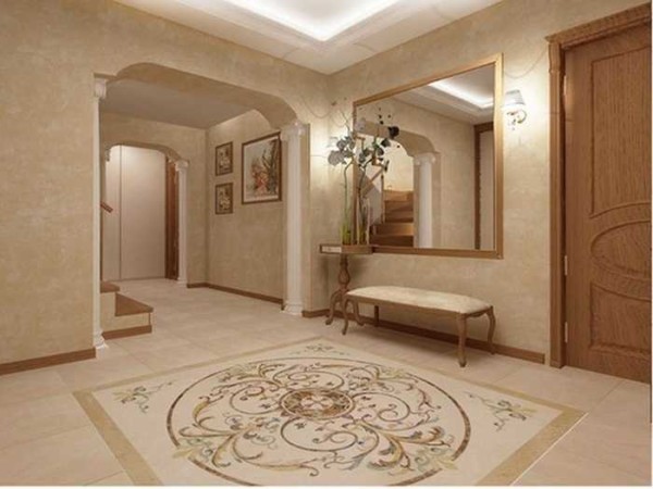 Пол — просто деревянный из дорогих пород дерева или паркет, причем паркет декоративный или дворцовый — мозаики и панно с растительными мотивами из разных пород дерева. Допустимы, но редко в нашей стране используются мраморные полы с инкрустацией и орнаментами. Как альтернативу мрамору можно рассмотреть наливные полы, близкие по виду к мрамору.