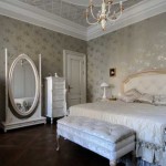 Оформление стен — однотонное или с неярким повторяющимся рисунком — вензелями, полосами, растительными мотивами. Соответственно и выбор отделочных материалов — дорогие обои, декоративная штукатурка или покраска.