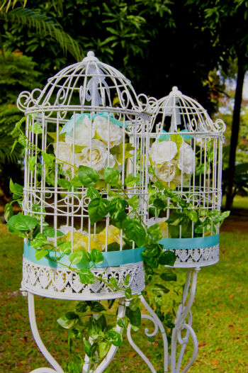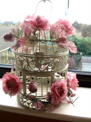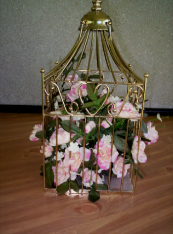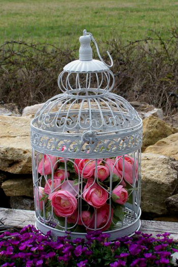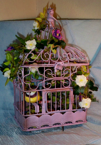 Чаще всего клетка для птиц в интерьере декорируется цветами, причем это могут быть, как искусственные цветы, так и настоящие. Но как же декорировать клетку живыми цветами, они же быстро завянут? Здесь все просто, нужно использовать не срезанные цветочки, а цветущие комнатные растения в горшках. Но это вовсе не означает, что композицию из срезанных цветов использовать нельзя, напротив, такая клетка сделает букет еще ярче и интересней. Верхняя часть клетки обычно легко открывается (по бокам есть крепления), раскрыв таким образом клетку, внутрь можно поместить любые предметы, в данном случае горшок или вазу с цветами. Такой декоративный предмет, вполне можно поставить на каминную полочку, журнальный столик или комод в спальне.