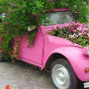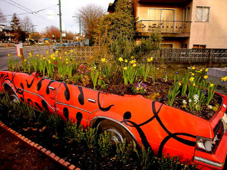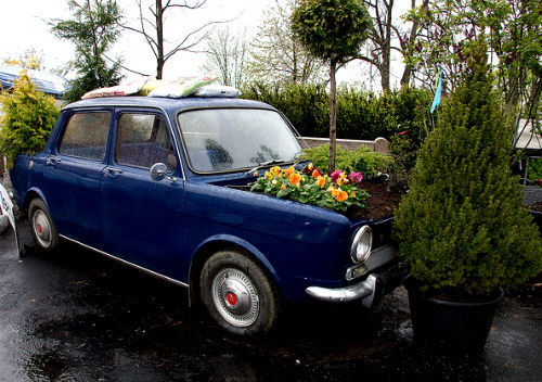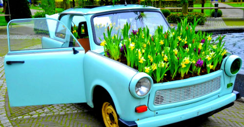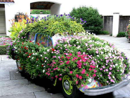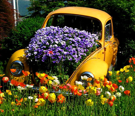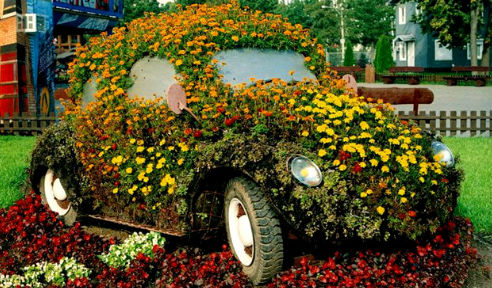 Теперь о вариантах декорирования клумбы из машины, цветы можно посадить в багажнике, можно спереди под капотом, можно в салоне, и последний вариант — посадить вьющиеся цветы, которые со временем оплетут корпус авто, целиком.