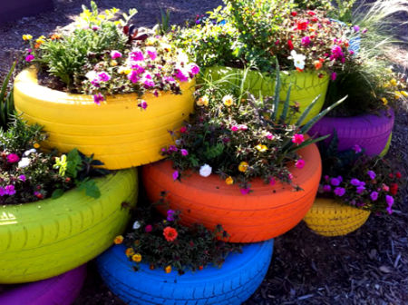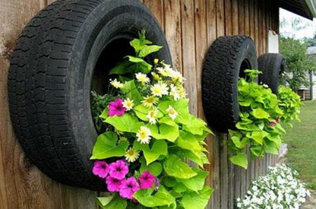 Дополнить клумбу машину можно также самыми обычными автомобильными покрышками, которые уже давно применяются для бюджетного оформления ландшафта. С ними все просто, укладываем на землю, дно покрываем керамзитом и засыпаем доверху землей, на завершающей стадии высаживаем цветы.