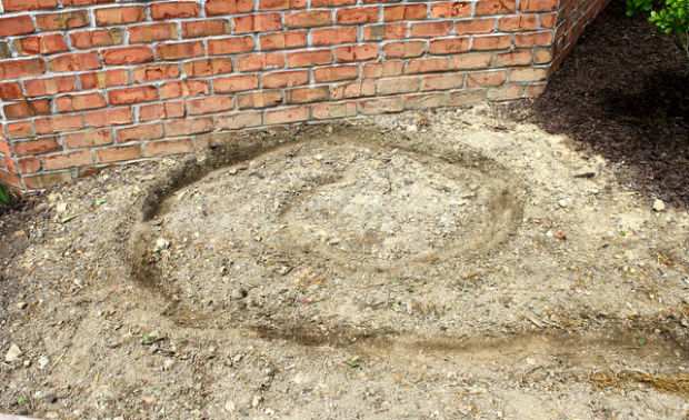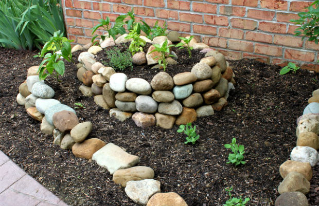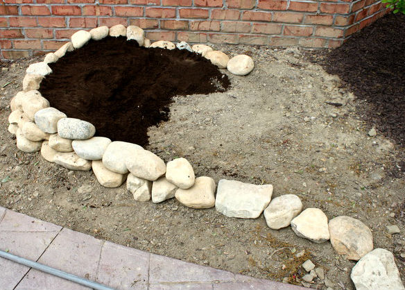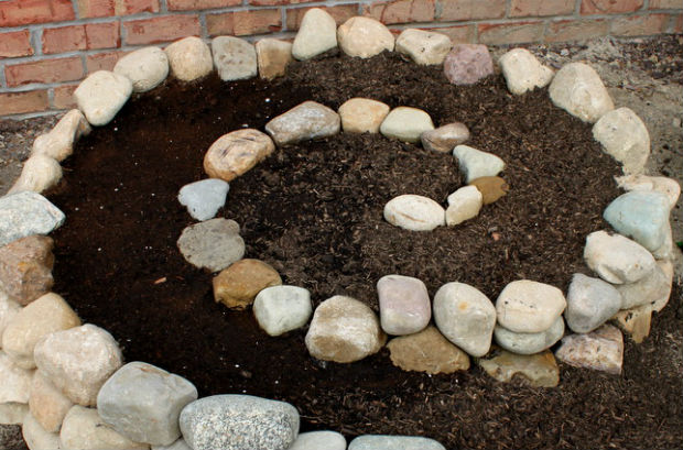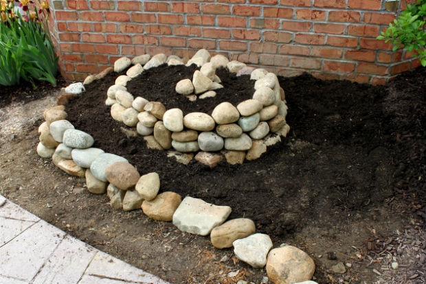 Вариантов декора клумб камнями существует огромное количество. Из наиболее популярных можно выделить выкладку торцевой части сланцем, или выкопанный ров, засыпанный крупной галькой, ну или базальт, аккуратно выложенный вдоль клумбы. Ну а мы ниже хотим продемонстрировать фото-инструктаж по создания интересной спиралевидной клумбы, выложенной крупной галькой.