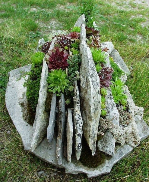 Известняк или песчаник. Это самый распространенный материал для отделки клумб. Известняк ко всему прочему может служить и прекрасной основой для непосредственной высадки растений, и все это благодаря его структуре, которая при ближайшем рассмотрении выдает свою пористость. В этом случае камень просто припорашивается землей, и поверх высаживаются растения с неразвитой корневой системой, допустим декоративный мох. Ну а выбирая песчаник нужно знать, что со временем он будет разрушаться от погодных воздействий, т.е. он не долговечен.