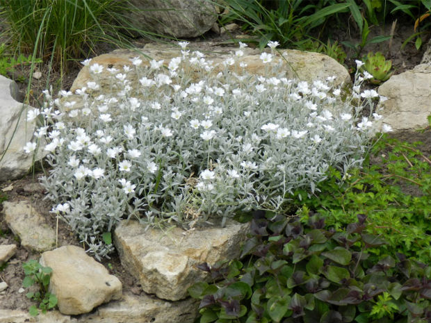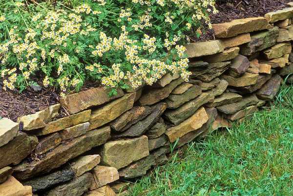 Камень туф отлично ладит с вьющимися цветами, а также ковровыми растениями.