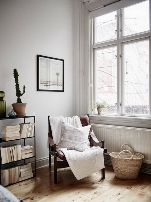 У вас есть этажерка? — превратите ее в небольшую библиотеку! Если обложки книг потеряли свой внешний вид, то можно расставить или разложить их боковыми обрезами вперед. Так, легкая желтизна страниц будет гармонично перекликаться со всеми деревянными элементами интерьера и создавать ощущение уюта.