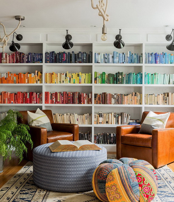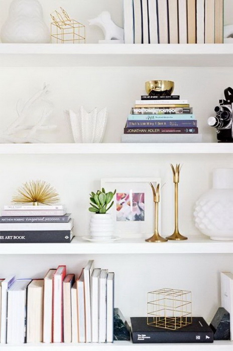 Задействуйте свою фантазию и создайте уникальную композицию на полках, используя различные оттенки книжных корешков и дополнительные декоративные элементы: свечи, рамки с фотографиями, статуэтки и так далее.