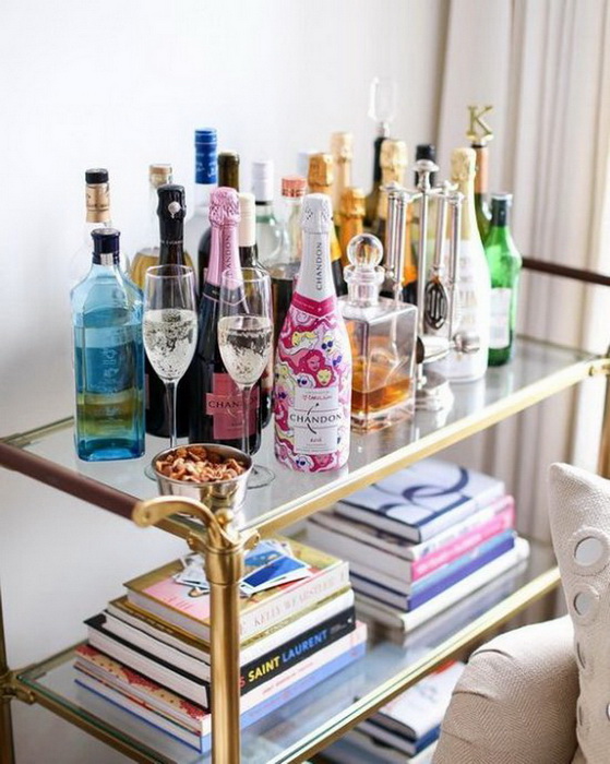 Проще всего использовать в целях декора симпатичную мобильную тележку. И если верхняя полка по праву принадлежит напиткам, то нижнюю можно украсить книгами.