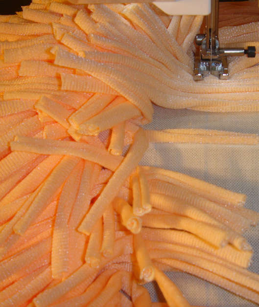 • укладываем на основание рядами трубочки из ткани и пришиваем строго посередине;