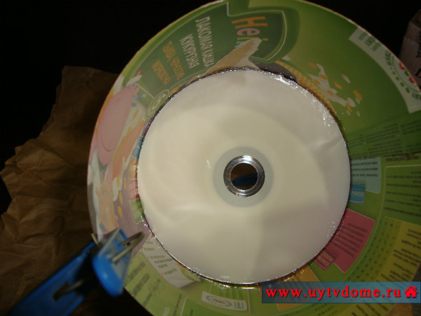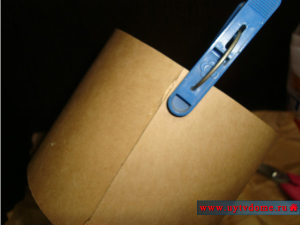 ► Наносим клей по кромке CD-диска и приклеиваем к нему подготовленную ранее полосу из картона, склеиваем изделие по боковой части. Прихватываем сверху прищепкой. Ждем, когда клей просохнет.