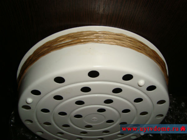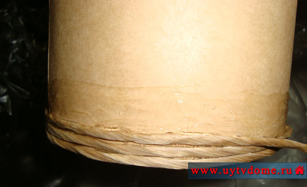 ► Приступаем к декору шпагатом. Наносим полимерный клей по нижней части будущей корзинки, прикладываем шпагат и создаем обмотку по периметру изделия, когда несколько обмоток будет совершено, пальцами аккуратно сдвигаем шпагат вниз, так чтобы все нити плотно прилегали друг к другу. По такой схеме покрываем шпагатом всю поверхность корзинки. Оставляем изделие сохнуть.