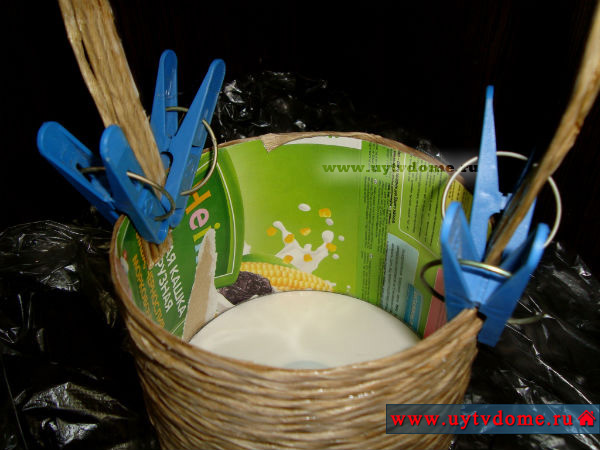 ► В глубокую тарелочку вливаем клей ПВА, нарезаем шпагат на отрезки длиной желаемой ручки,  примерно 5 отрезков. Погружаем их в миску с клеем ПВА, затем вытаскиваем по одному и укладываем на боковую поверхность ранее подготовленной большой чаши. Оставляем сушиться примерно на 12 часов. Затем аккуратно отделяем ручку из шпагата от чаши, и приклеиваем к внутренней части корзинки, фиксируем ручки по обе стороны прищепками. Ждем, когда клей высохнет.