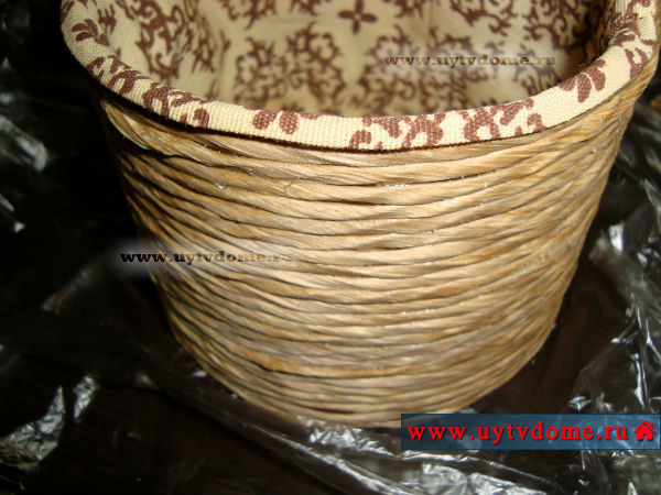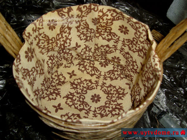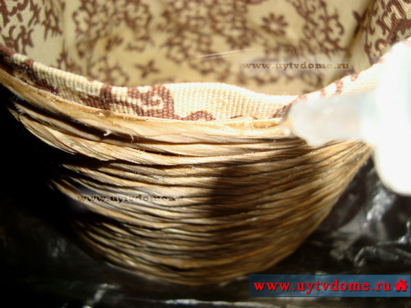 ► Укладываем подкладку в корзинку, приклеив дно и частично боковые ее части. Затем наносим клей по верхней кромке корзины и приклеиваем подкладку с минимальным выпуском наружу.